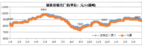 今年一季度,铬铁价格呈现整体上涨态势,加速了铬铁新增产能的释放。 但不锈钢市场持续疲软,铬铁需求减少,导致一季度国内铬铁供应宽松过剩。 4月铬铁产量将维持在600,000吨左右,而下游钢厂的减产幅度将继续扩大,铬铁供大于求的情况可能进一步扩大,导致4月铬铁价格缓慢下跌。