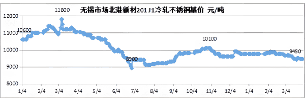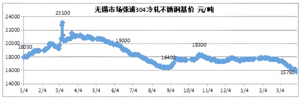 在生产成本下降、需求疲软和库存高企的多重压力下,3月份不锈钢价格快速下跌。 截至3月底,304民营四脚冷轧资源主流降至原边14,650-15,100元/吨区间,国有大厂四脚冷轧资源主流降至修整15,750-16,050元/吨区间,无锡、佛山304民营五脚热轧板坯资源主流降至原边14,600-14,950元/吨区间;304冷热轧板价格较2月年底价格下降近2,000元/吨。 截至3月底,201方面,无锡、佛山的J1型四脚冷轧资源主流毛边降至9,300-9,450元/吨区间,J2J5资源毛边降至8,700-8,850元/吨区间,比2月年底低约250元/吨。 截至3月底,中报430冷轧主流价格在7850-7950元/吨区间,较2月底下跌约650元/吨。